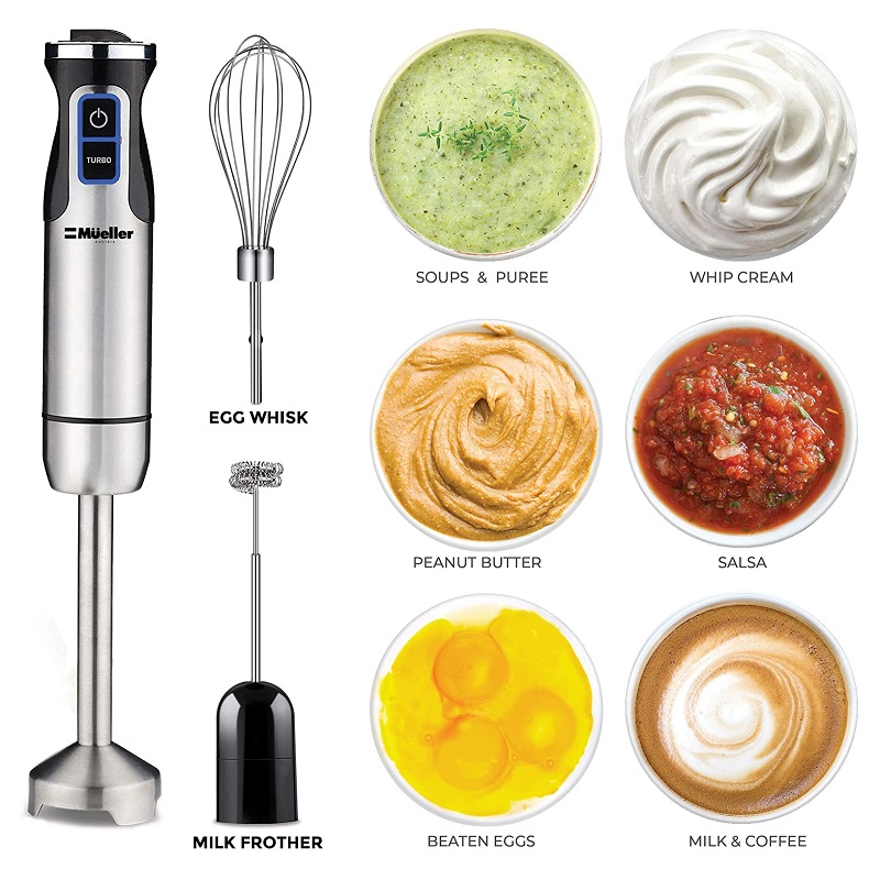 El Mueller Ultra-Stick se puede utilizar para hacer deliciosos dulces como salsa, pesto, panqueques e invierno, masa, batidos, salsa de queso, salsa de tomate casera, salsa holandesa, crema batida, mantequilla de manzana, varios platos indios, sopas y pasteles. También se puede utilizar para cortar y hacer cócteles y mucho más.